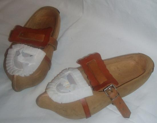 En peuplier, renforcés aux endroits fragiles par des cuirs, munis de brides, ils sont décorés par les renoms faits de rubans plissés comme la collerette.